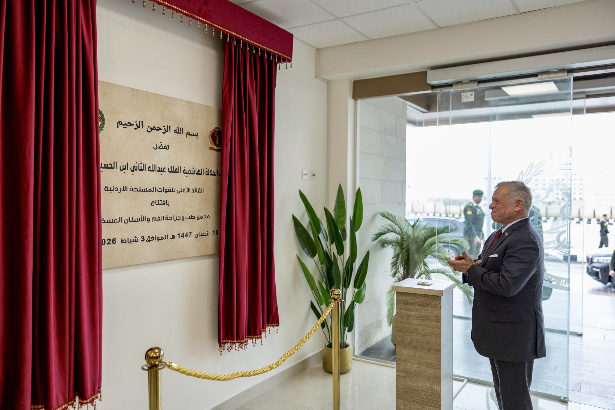 افتتح جلالة الملك عبدﷲ الثاني، القائد الأعلى للقوات المسلحة، اليوم الثلاثاء، مجمع طب وجراحة الفم والأسنان العسكري التابع لمديرية الخدمات الطبية الملكية بمنطقة خلدا في عمان.