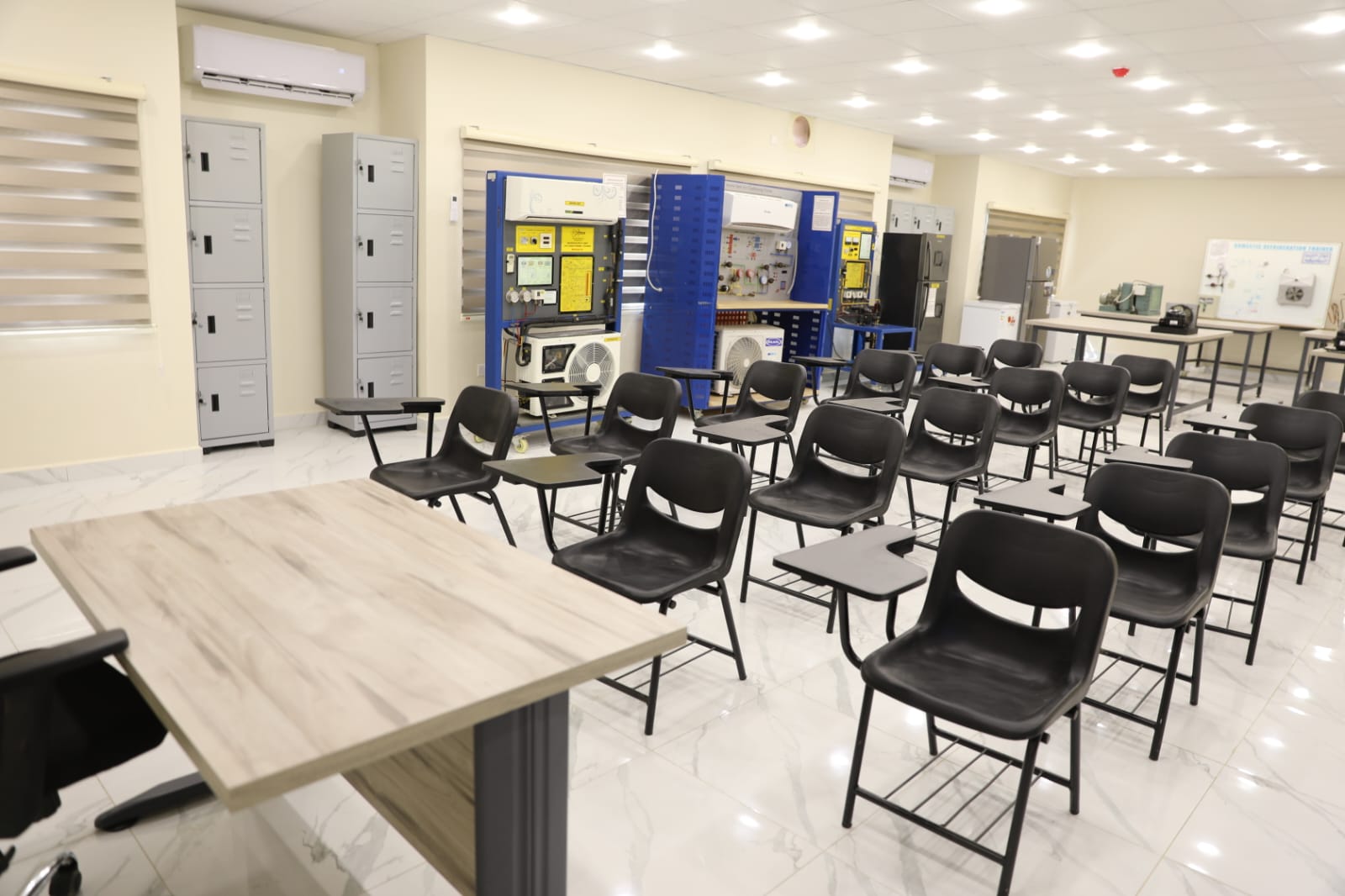 ويضم المركز أربعة مبانٍ رئيسية بطاقة استيعابية تصل إلى (220) متدرباً في الدفعة الواحدة، ويقدّم تخصصات نوعية تواكب مهن المستقبل، من أبرزها السلامة والصحة المهنية، الألياف الضوئية، تطبيقات الهواتف الذكية، مختبر الواقع الافتراضي، وصيانة السيارات الكهربائية والهجينة، إضافة إلى تخصصات للإناث تشمل الخياطة والتجميل، بما يعزز الشمولية وتكافؤ الفرص في التدريب.