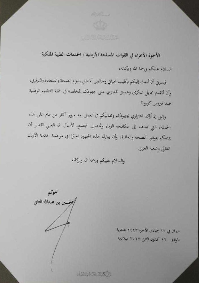 رسالة شكر وتقدير من سمو ولي العهد إلى مديرية الخدمات الطبية الملكية