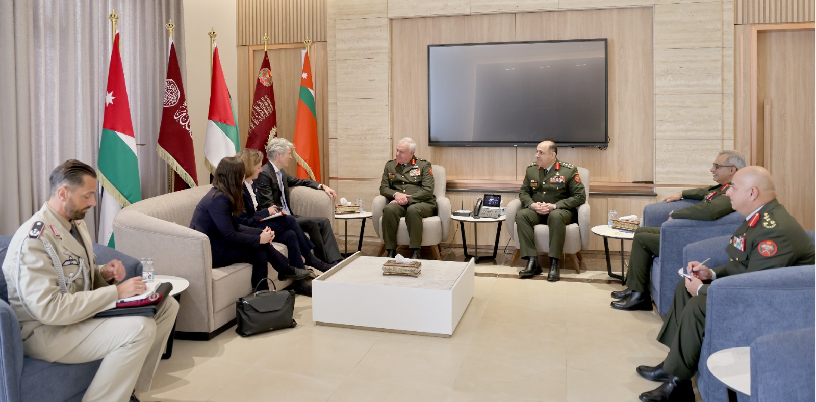 Chairman of the Joint Chiefs of Staff Maj. Gen. Yousef Ahmad AL-Huneiti on Tuesday received the Director General for Security and Defense Policy at the German Federal Ministry of Defense, Jasper Wieck, and the accompanying delegation at the General Command headquarters.
