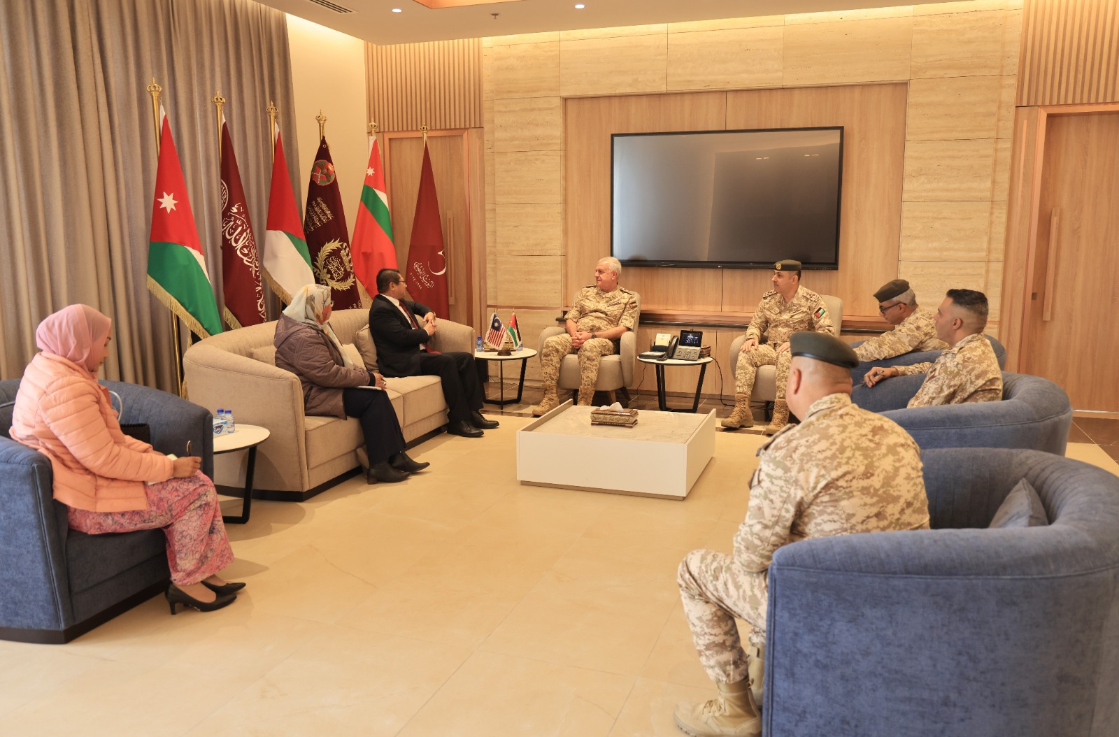 Chairman of the Joint Chiefs of Staff, Maj. Gen. Yousef Ahmed Al-Hunaiti, received, today, Monday, the Malaysian Ambassador to Amman, Muhammad Nasri bin Abdul Rahman. Al-Hunaiti and bin Abdul Rahman talked about the most recent events on the regional and global arenas as well as aspects of cooperation and joint coordination in a variety of fields in order to further the interests of the armed forces in the two friendly countries. Al-Hunaiti emphasized the need to unite international efforts to achieve international security and peace as well as the significance of strengthening the strategic partnership between the two countries. The Malaysian Ambassador commended the pivotal role of the Hashemite Kingdom of Jordan, led by His Majesty King Abdullah II, in maintaining security and stability in the region. The Deputy Ambassador and Chargé d'Affaires in Jordan and several senior officers of the Jordan Armed Forces - the Arab Army attended the meeting.